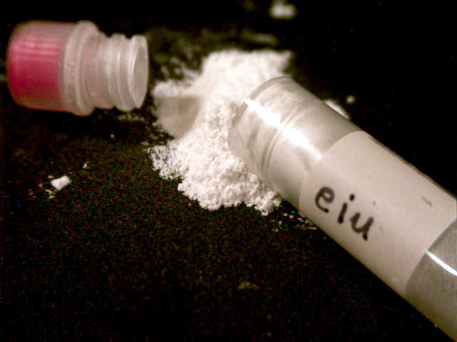 satisfied customer with her vial of processed powdered pathogen